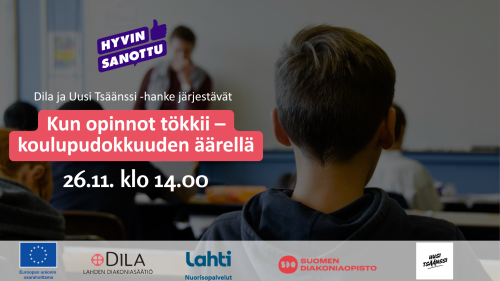 Dila ja Uusi Tsäänssi- hanke järjestävät keskiviikkona 26.11. klo 14.00 Erätauko-keskusteluun aiheesta Kun opinnot tökkii – koulupudokkuuden äärellä. Keskustelua voi seurata paikan päällä tai striimin välityksellä. Tapahtuma on osa Ylen ja Erätauko-säätiön lanseeraamaa Hyvin sanottu – keskustelufestivaalia, jonka tavoitteena on kehittää rakentavaa keskustelukulttuuria Suomessa dialogisuuden keinoin.