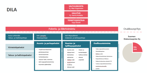 Diakoniasäätiön toiminta muodostuu palvelu- ja liiketoiminnasta sekä tukipalveluista. Palvelu- ja liiketoiminta jakautuu kolmeen toiminta-alueeseen, jotka ovat asumis- ja perhepalvelut, nuoriso- ja työllisyyspalvelut sekä osallisuustoiminta. Laitoksen johtoryhmään kuuluvat toimitusjohtajan lisäksi toiminta-alueiden johtajat.