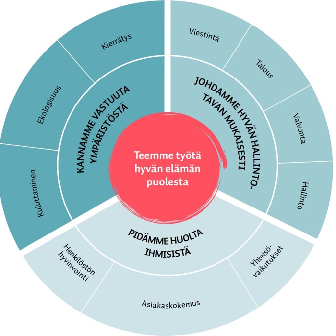 Noudatamme hyvää hallintotapaa ja pidämme huolta siitä, että toimintamme on lakien ja säädösten mukaista sekä eettisesti kestävää. Haluamme viestiä mahdollisimman avoimesti ja vastuullisesti toiminnastamme, kuitenkin ihmisten yksityisyyden ja tietosuojan varmistaen.